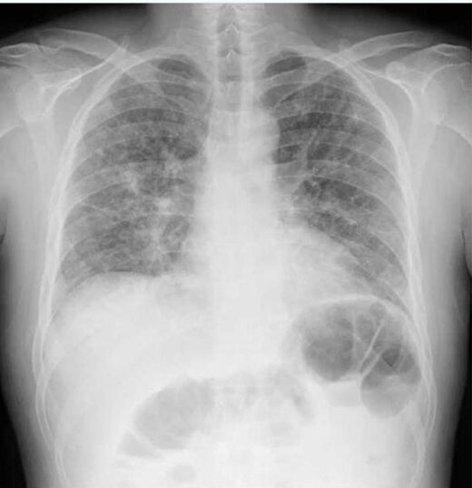 本症例では肺が小さく、横隔膜が挙上し両側肺野に、もやもやした濃度上昇(両側のすりガラス陰影)があることが確認できます。