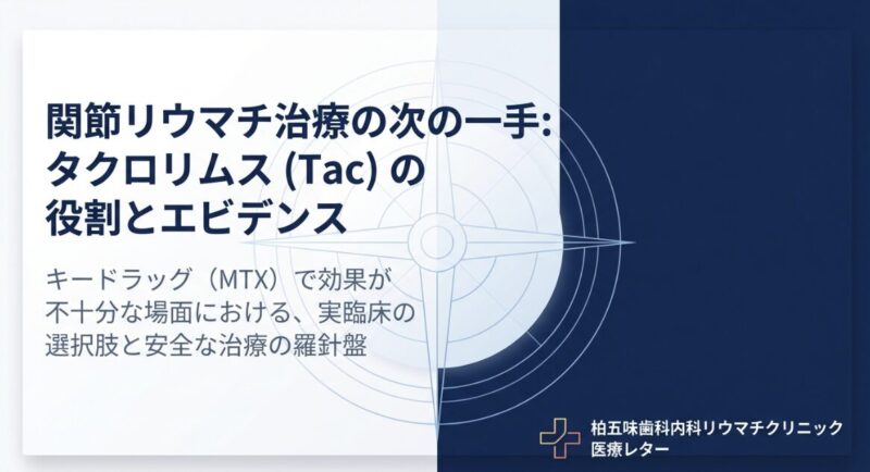 関節リウマチ(RA)の治療において、第一選択薬(キードラッグ)であるメソトレキセート(MTX)で十分な効果が得られない場合、併用薬として重要な選択肢となるのが免疫抑制剤のタクロリムス(Tac)です。タクロリムスは、主にT細胞の活性化を抑えることで強力に炎症を抑制し、関節の破壊を防ぐ薬剤です。