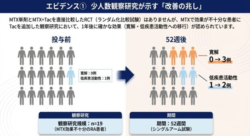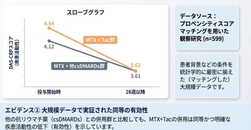 臨床的なエビデンスとして、MTX単剤で効果不十分な患者にタクロリムスを追加した観察研究では、1年後に臨床的寛解や低疾患活動性を達成する例が確認されています。また、599名を対象とした大規模なプロペンシティスコアマッチング解析においても、MTXにタクロリムスを併用する治療法は、他の従来型合成抗リウマチ薬(csDMARDs)を併用する場合と比較して、疾患活動性指標であるDAS-CRPを有意に改善させることが示されました。実臨床では、MTXにサラゾスルファピリジンやブシラミン、あるいはこのタクロリムスを組み合わせて多角的にアプローチすることが一般的です。