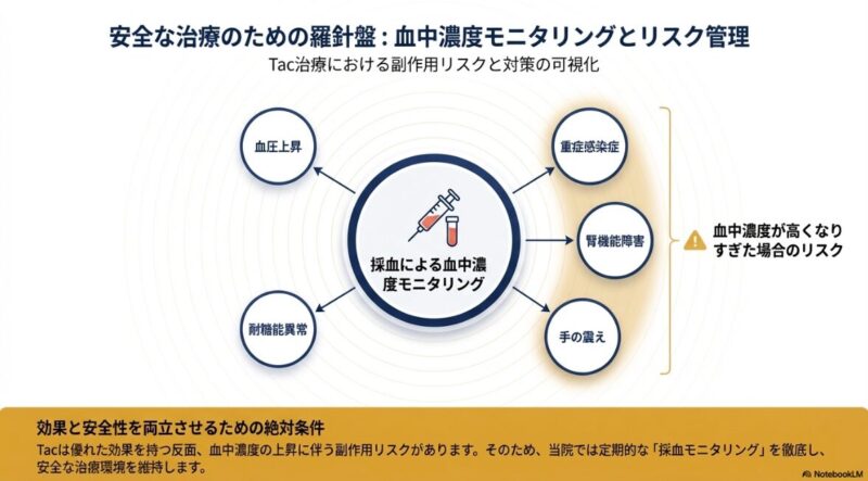 一方で、タクロリムスの使用には細やかな副作用管理が欠かせません。主な副作用として、血圧上昇耐糖能異常(血糖値の上昇)が挙げられます。また、血中濃度が高くなりすぎると、腎機能障害や重症感染症、手指の震え(振戦)などが生じるリスクがあるため、定期的な採血による血中濃度モニタリング(TDM)を行い、患者様ごとに有効かつ安全な投与量を維持することが治療成功の鍵となります。