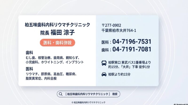 柏五味歯科内科リウマチクリニックでは、症状の背景にある「体の仕組み」まで丁寧に説明しながら、内科・リウマチ・膠原病診療を行っています。「なぜこの症状が起きるのか」を理解することを大切にしています。 柏市・我孫子市周辺で、関節の痛みや原因の分からない体調不良にお悩みの方は、どうぞお気軽にご相談ください。