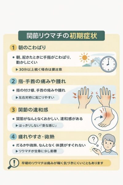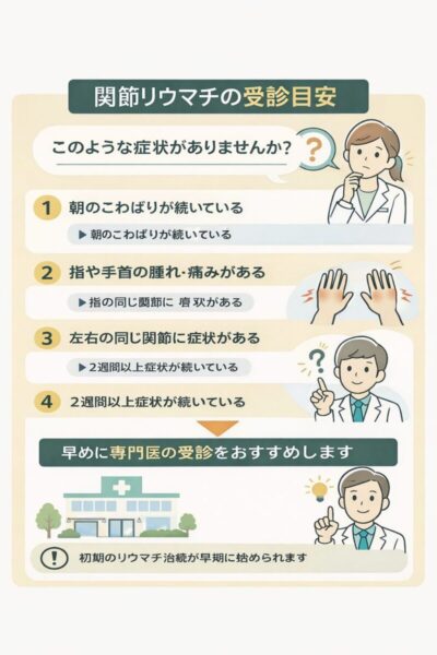 朝のこわばりが続く 指や手首の腫れ・痛みがある 左右同じ場所に症状がある 2週間以上続いている