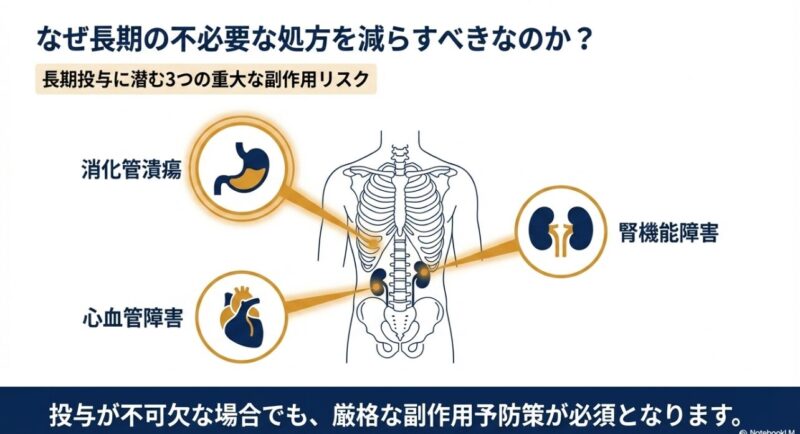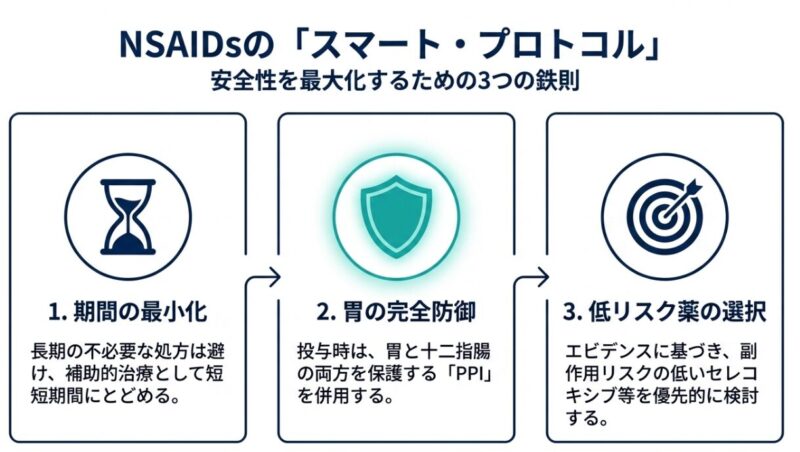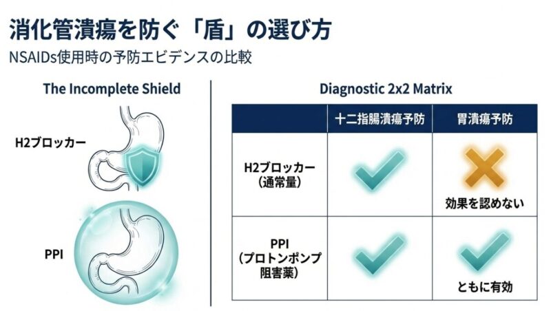 特に臨床現場で大きな課題となる消化管障害の予防策については、明確なエビデンスが存在します。胃薬として処方されることもあるH2ブロッカーは、通常量では十二指腸潰瘍の予防には有効ですが、胃潰瘍の予防効果は認められていません。これに対し、PPI(プロトンポンプ阻害薬)は胃と十二指腸双方の潰瘍予防に高い有効性を示すため、リスクが高い場合にはPPIの併用が強く推奨されます。