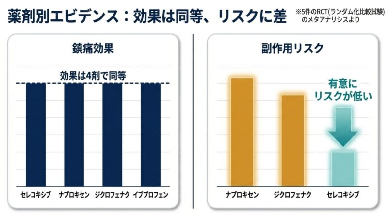 また、具体的な薬剤選択において、セレコキシブ(セレコックス)は注目すべき特徴を持っています。5件のランダム化比較試験(RCT)をまとめたメタアナリシスによれば、セレコキシブの鎮痛・抗炎症効果はナプロキセンやジクロフェナクと同等でありながら、副作用のリスクはこれらと比較して有意に低いことが証明されています。リウマチ診療においては、痛みを単に抑えるだけでなく、最新の知見に基づき「体の仕組み」を考慮した最適な薬剤選択を行うことが、安全に治療を継続するための鍵となります。