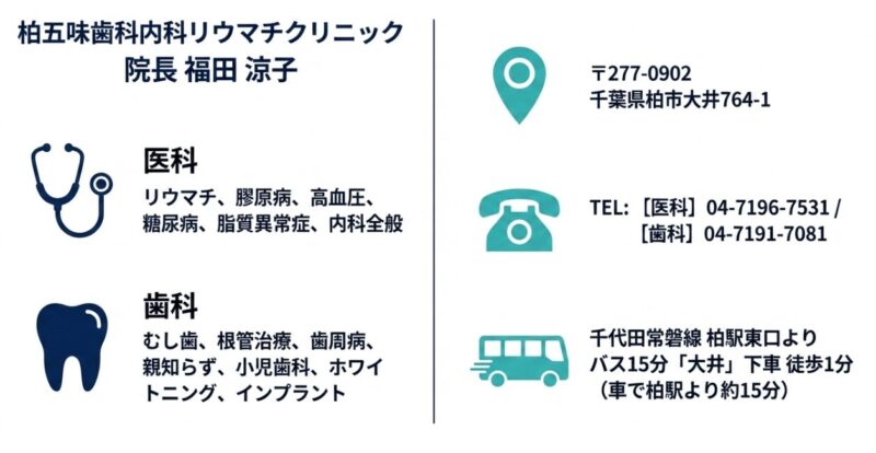 最後に、柏五味歯科内科リウマチクリニックでは、症状の背景にある「体の仕組み」まで丁寧に説明しながら、内科・リウマチ・膠原病診療を行っています。「なぜこの症状が起きるのか」を理解することを大切にしています。 柏市・我孫子市周辺で、関節の痛みや原因の分からない体調不良にお悩みの方は、どうぞお気軽にご相談ください。