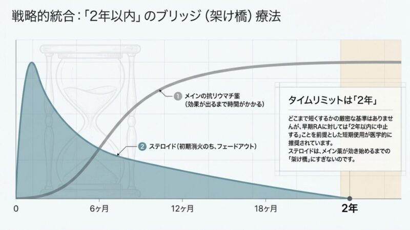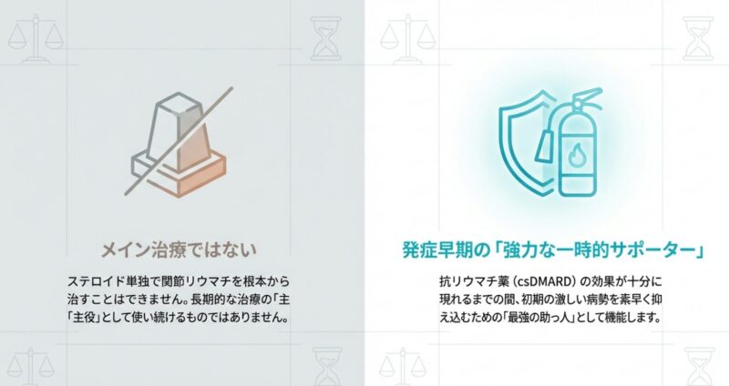関節リウマチ(RA)の治療において、プレドニゾロンなどのステロイド(PSL)は、炎症を速やかに抑えるための強力な武器となります。しかし、最新の知見では、ステロイドはあくまで「メイン治療を補う補助的な役割」として位置づけられており、長期的な服用には慎重な判断が求められます。