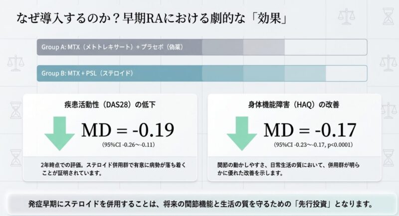 臨床試験(RCT)の結果によると、発症早期の患者様に対して、第一選択薬のメソトレキセート(MTX)疾患活動性(DAS28)が低下し、身体機能(HAQ)が改善することが証明されています。これは、抗リウマチ薬の効果が十分に現れるまでの「橋渡し(ブリッジング療法)」として、初期の苦痛を取り除くために非常に有効であることを示しています。
