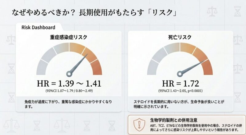 一方で、ステロイドの長期継続は無視できないリスクを伴います。研究データでは、長期間の使用が重症感染症や重篤な有害事象を招き、結果として死亡リスクを有意に高めるという深刻な結果も報告されています。特にアバタセプト(ABT)やトシリズマブ(TCZ)といった生物学的製剤との併用時には、感染症リスクがさらに増大する傾向にあるため、厳重な管理が必要です。