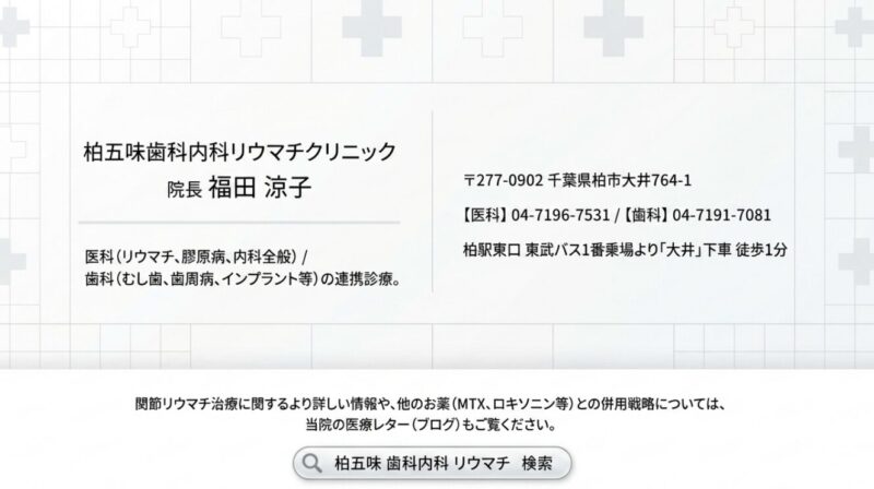 最後に、柏五味歯科内科リウマチクリニックでは、症状の背景にある「体の仕組み」まで丁寧に説明しながら、内科・リウマチ・膠原病診療を行っています。「なぜこの症状が起きるのか」を理解することを大切にしています。 柏市・我孫子市周辺で、関節の痛みや原因の分からない体調不良にお悩みの方は、どうぞお気軽にご相談ください。