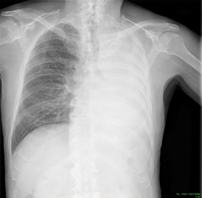 片側胸水を見たとき、どこから胸水が来ていそうか考えることが重要というのは以前のレントゲン写真で説明しました。今回は無気肺のレントゲン写真です。