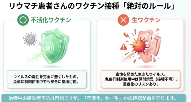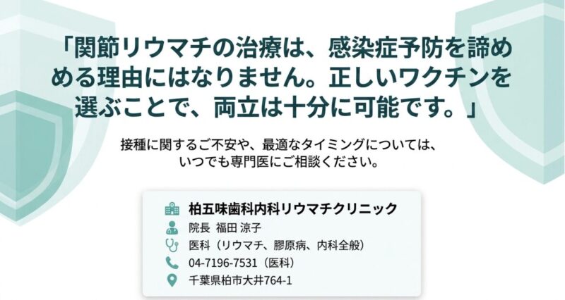 感染症リスクを抑えつつリウマチ治療を安心して継続するためには、接種のタイミングやワクチンの種類について、専門医による適切な判断が欠かせません。