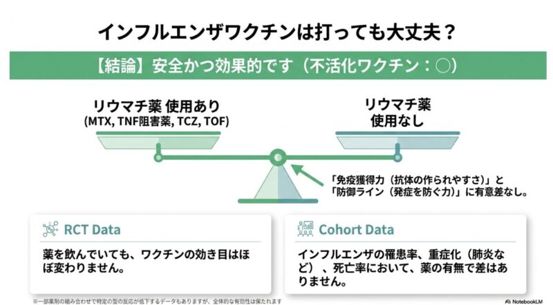 関節リウマチ(RA)ワクチン接種は極めて重要ですが、「治療薬との兼ね合いでどのワクチンが安全に打てるのか」という疑問は少なくありません。リウマチ専門医の視点から、主要なワクチンの有効性と安全性について医学的エビデンスに基づき解説しています。