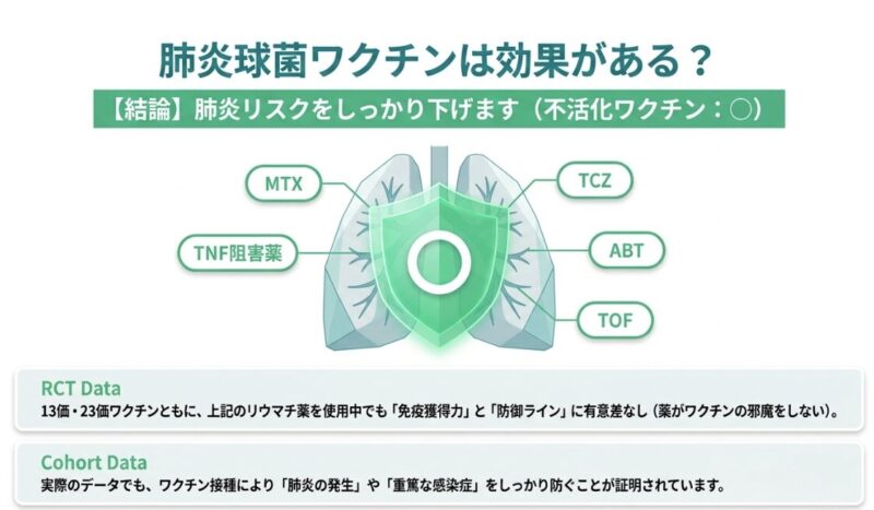 まず、インフルエンザ肺炎球菌(13価、23価)などの不活化ワクチンについては、メソトレキセート(MTX)や生物学的製剤(TNF阻害薬、トシリズマブ、アバタセプト)、JAK阻害薬(トファシチニブ)を投与中であっても、多くの場合で防御閾値以上の抗体反応が得られることが報告されています。一部の薬剤の組み合わせで抗体上昇がわずかに低下する可能性は指摘されていますが、全体的な予防効果や安全性において重大な懸念はなく、積極的な接種が推奨されます。