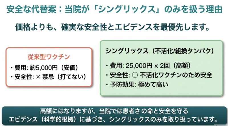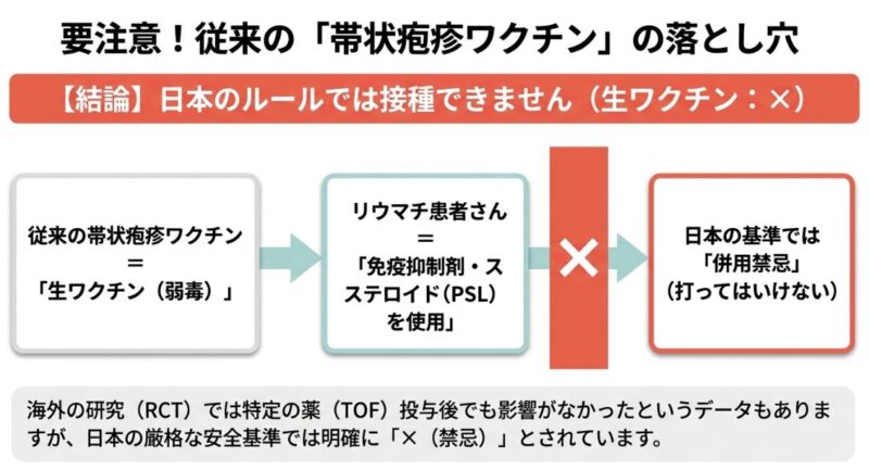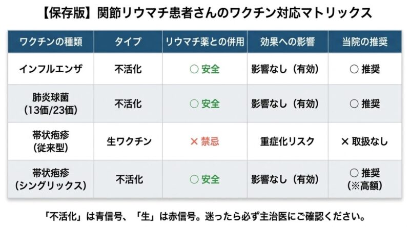 一方で、最も注意が必要なのが生ワクチンです。日本では、ステロイド(PSL)や免疫抑制剤を服用中の患者様に対する生ワクチンの接種は原則「禁忌」とされています。特に帯状疱疹については、従来の弱毒生ワクチンは避け、最新の不活化ワクチンであるシングリックスを接種することが無難かつ推奨される選択です。シングリックスは生ワクチンと比較して費用は高額ですが、リウマチ治療中の免疫力が低下した状態でも安全に、かつ高い予防エビデンスを持って接種することが可能です。