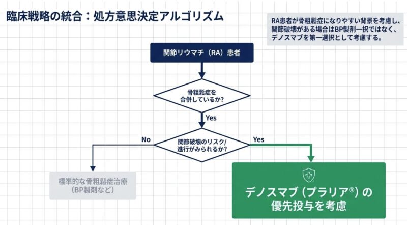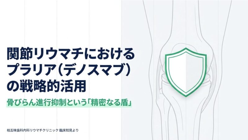 また、関節リウマチ患者様は疾患の影響や治療で用いられるステロイドの影響により、非常に骨粗鬆症を合併しやすい傾向にあります。これまでは骨粗鬆症治療としてビスホスホネート(BP)製剤が広く用いられてきましたが、特に関節破壊のリスクが高い症例においては、骨密度を改善すると同時に「関節破壊を食い止める」という付加価値を持つデノスマブを第一選択として検討する戦略が有効です。柏五味歯科内科リウマチクリニックでは、単に炎症を抑えるだけでなく、骨の構造維持まで見据えた多角的なアプローチにより、患者様の手指の変形を最小限に抑える精密なリウマチ診療を実践しています。