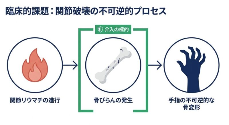 関節リウマチ(RA)の治療において、痛みや腫れを抑えることと同じくらい重要なのが、将来の生活の質(QOL)を左右する「関節の変形」を防ぐことです。関節の変形は、炎症によって骨が削れる「骨びらん」が進行することで引き起こされますが、最新の医学的エビデンスにより、抗RANKL抗体製剤であるデノスマブ(商品名:プラリア)が、この骨びらんの進行を強力に抑制することが明らかになっています。