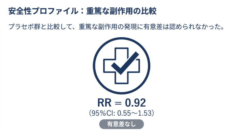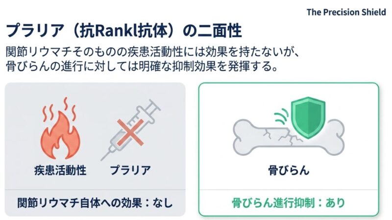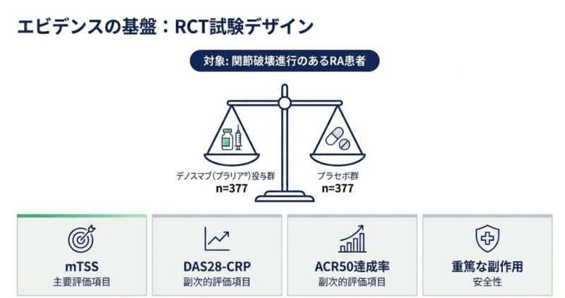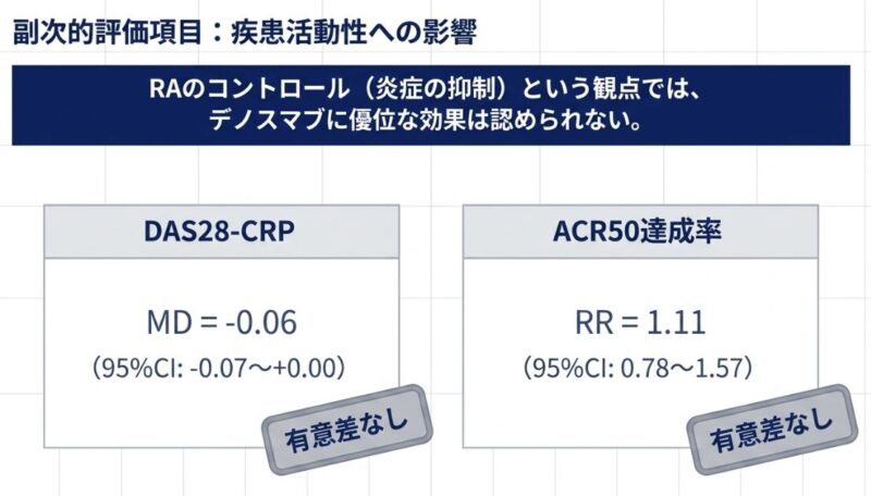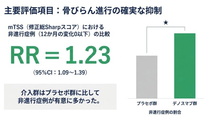 大規模なランダム化比較試験(RCT)において、デノスマブ投与群はプラセボ群と比較して、関節破壊の進行度を示すmTSS(修正総Sharpスコア)が悪化しない「非進行症例」の割合が有意に高い(相対リスク 1.23)ことが示されています。興味深いことに、デノスマブは関節リウマチの炎症そのものを抑える効果(DAS28やACR50の改善)についてはプラセボと有意差が認められませんが、骨の構造を守るという点において特異的かつ優位な効果を発揮します。