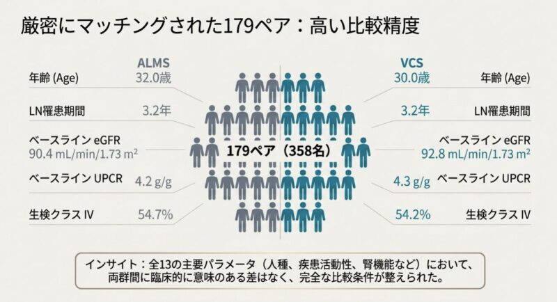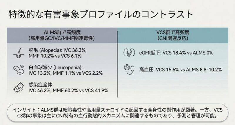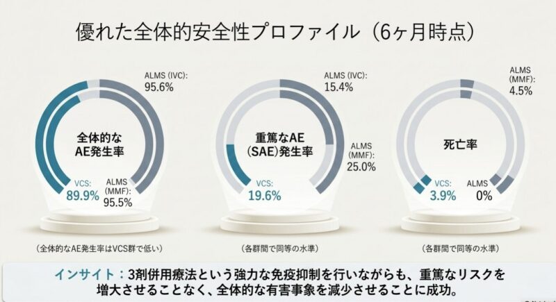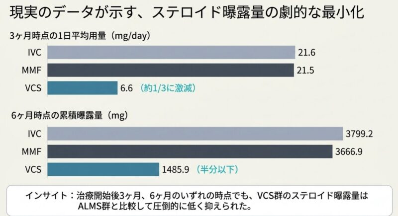 傾向スコアマッチングによる解析の結果、治療開始から6ヶ月間において、ボクロスポリン群は従来療法と比較して、尿蛋白(UPCR)のより早期かつ大幅な減少を達成しました。安全性についても、全体的な有害事象(AEs)の発生率はボクロスポリン群で低いことが示されました。特に、ボクロスポリンを用いた治療プロトコルではステロイドを速やかに減量できたため、従来療法で多く見られた精神症状、内分泌異常、筋骨格系障害といった「ステロイド毒性」に関連する副作用のリスクを軽減できることが明らかになりました。