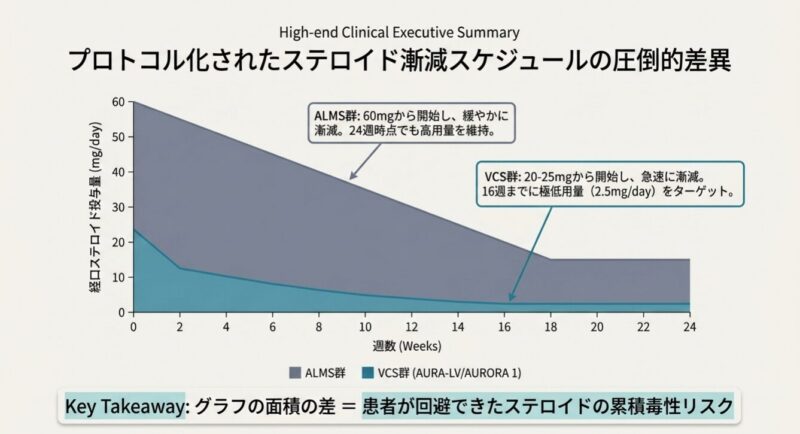 - ステロイドの管理: 初期用量を20〜25mg/日とし、16週目までに2.5mg/日以下まで速やかに減量(テーパリング)するプロトコルです。