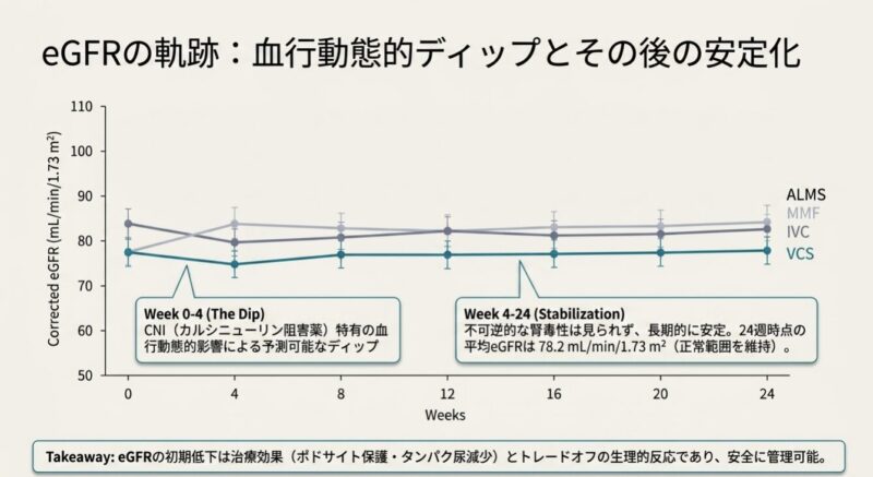 - 使用薬剤: ボクロスポリン(23.7mg 1日2回)+ ミコフェノール酸モフェチル(MMF 2g/日)+ 低用量ステロイド。
