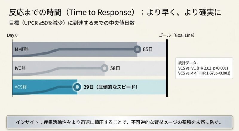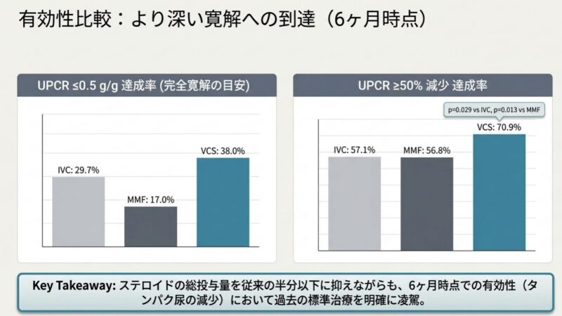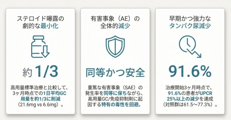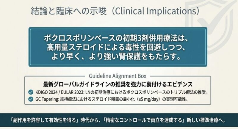 これらのデータは、活動性のループス腎炎患者に対し、ステロイドへの曝露を最小限に抑えつつ、ボクロスポリンを基軸とした三剤併用療法を初期治療(導入療法)として選択することを強く推奨するガイドラインを支持するものです。早期の尿蛋白改善は、長期的な腎不全のリスクや死亡率の低下に寄与する重要な指標であり、副作用を抑えながら迅速に効果を発揮するボクロスポリンは、現代のループス腎炎診療において不可欠な選択肢となります。