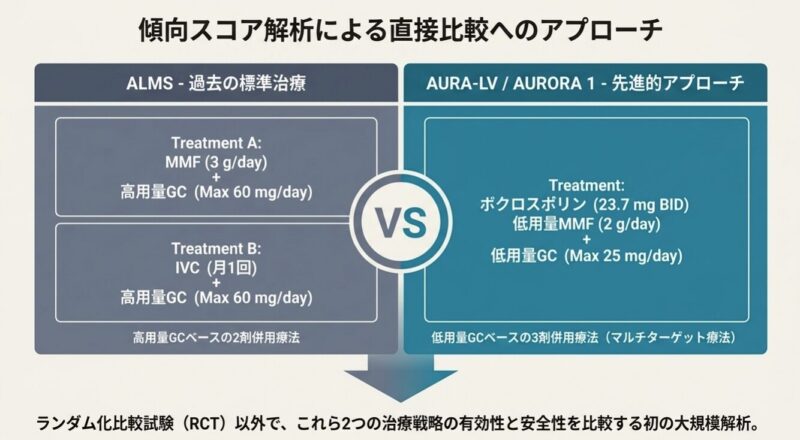 - ステロイドの管理: 初期用量を最大60mg/日という高用量から開始し、ボクロスポリン群に比べて緩やかに減量するプロトコルです。