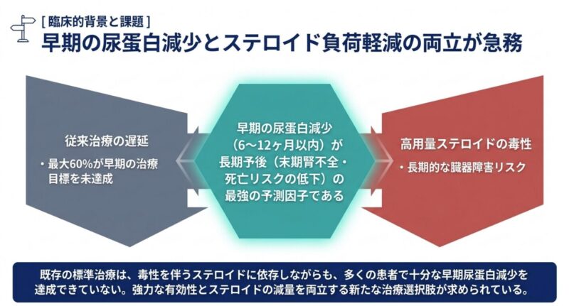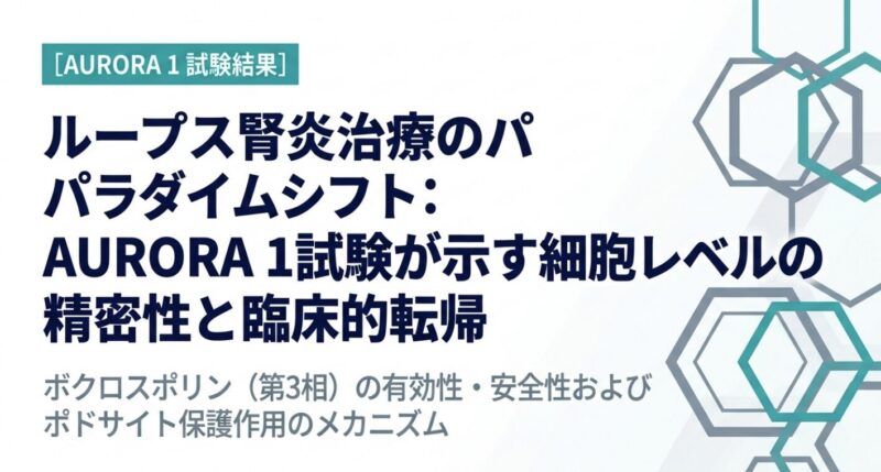 活動性ループス腎炎(LN)は、全身性エリテマトーデス(SLE)患者の約20%が診断後10年以内に末期腎不全(ESKD)へ進行する重篤な合併症です。治療の主眼は腎機能の保持と死亡率の低下にあり、特に治療開始後6〜12ヶ月以内の早期の蛋白尿減少が長期予後の最良の予測因子であることが示されています。新規カルシニューリン阻害薬(CNI)であるボクロスポリンの有効性を検証した国際共同第3相試験「AURORA 1」の結果に基づき、その臨床的意義を考察します。