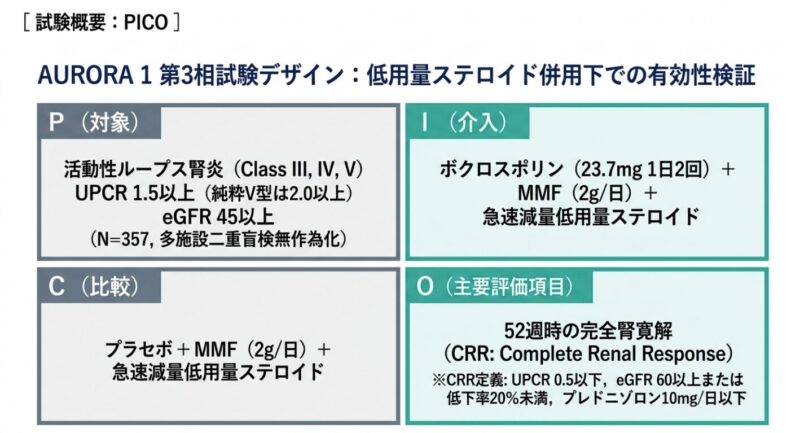 • O(Outcome): 52週時点の完全腎反応(CRR)達成率。CRRの定義は、①UPCR≦0.5 mg/mg、②eGFRの安定(≧60 mL/min/1.73 m²またはベースライン比20%以内の低下)、③レスキュー薬不使用、④低用量ステロイドの維持(週44〜52でプレドニゾン換算10mg以下)。