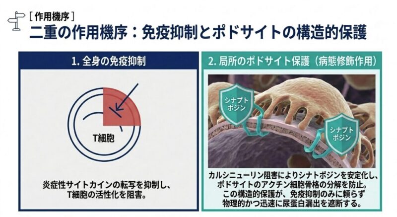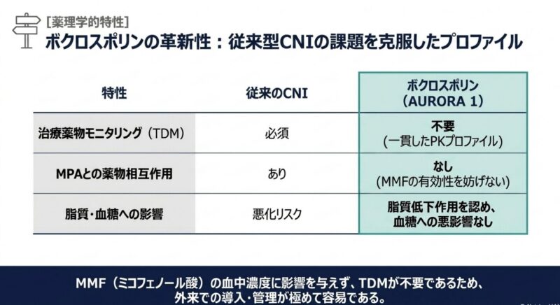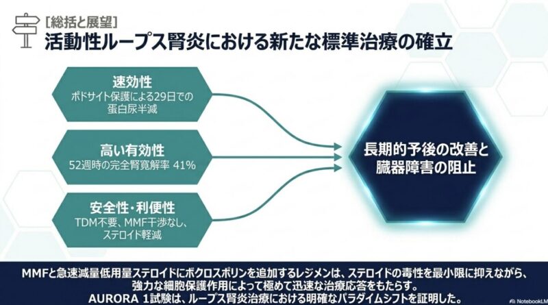 ボクロスポリンは、従来のCNIと比較して安定した薬物動態を有し、治療薬物モニタリング(TDM)を必要としない利点がある。作用機序としては、T細胞活性化の抑制(IL-2転写阻害)に加え、ポドサイト(足細胞)内のシナプトポジンを安定化させ、アクチン骨格の崩壊を防ぐ直接的な足細胞保護作用を併せ持つことが示唆されている。 本試験の意義は、「ステロイド曝露量を最小化しつつ、早期の腎反応達成率を向上させる」三剤併用療法の有用性を大規模な多施設共同試験で証明した点にある。特に、多様な人種を含む集団で一貫した効果が示されており、現代のLN導入療法における標準的な選択肢としての地位を確立したと言える。