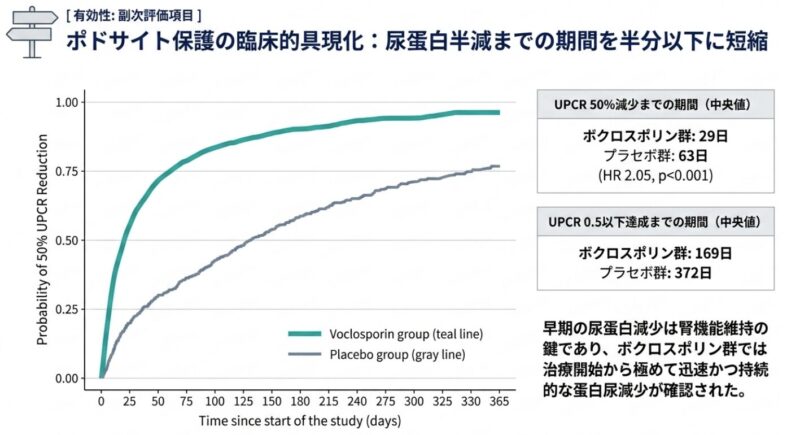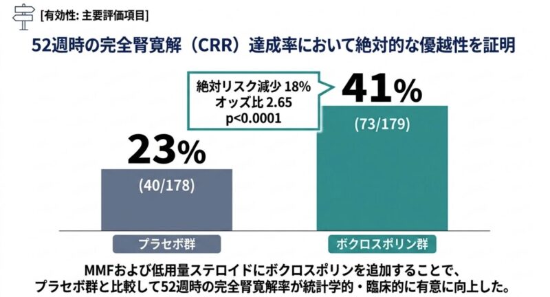 主要評価項目である52週時点のCRR達成率は、ボクロスポリン群で41%(73/179名)、プラセボ群で23%(40/178名)29日、プラセボ群で63日(ハザード比 2.05, p<0.001)であり、ボクロスポリンの迅速な抗蛋白尿作用が確認された。