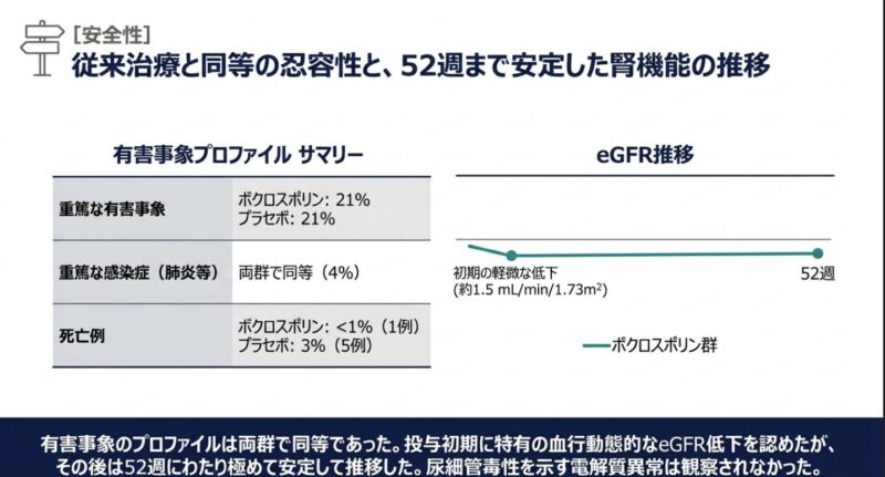 安全性については、重篤な有害事象(SAE)の発生率は両群とも21%で同等であった。感染症関連のSAE(主に肺炎)も両群で4%と均衡しており、ボクロスポリンの追加による過度な免疫抑制リスクの増大は認められなかった。また、ボクロスポリン群の死亡は1名(<1%)に対し、プラセボ群は5名(3%)であった。