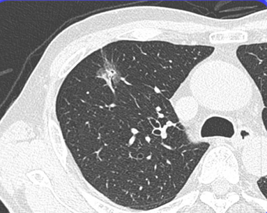 初期の肺癌の画像は読影がとても難しいです。「肺癌」を直接疑えなくても、異常陰影をとらえる、という順番で見ていくと「正常ではない」ことに気付け、精査へ進めます。今回は初期の肺癌画像です。分かるでしょうか?