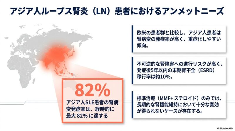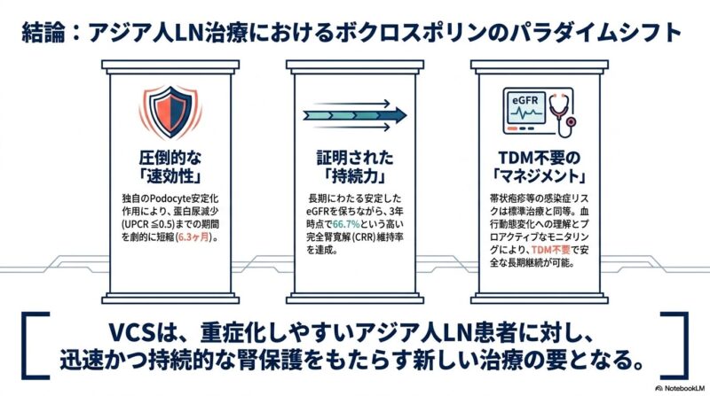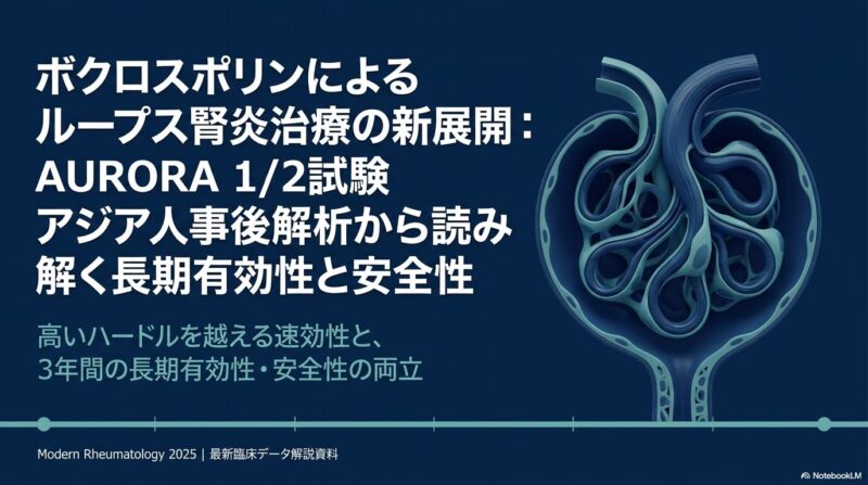 ボクロスポリンはアジア人患者においても、3年間にわたり腎機能を保持しつつ、迅速かつ持続的な蛋白尿減少をもたらします。血中濃度モニタリング(TDM)を不要とし、低用量ステロイド下で高い寛解率を維持できる本薬剤は、アジア人LN診療の重要な選択肢となる。