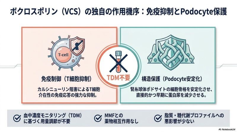 - I(Intervention): VCS(23.7 mg BID)+ ミコフェノール酸モフェチル(MMF 2g/日)+ 低用量ステロイド(急速減量プロトコル)。