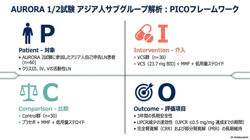 - P(Patient): AURORA 1試験を完了し、AURORA 2継続試験に参加したアジア人の活動性LN患者(計60名:VCS群30名、対照群30名)。