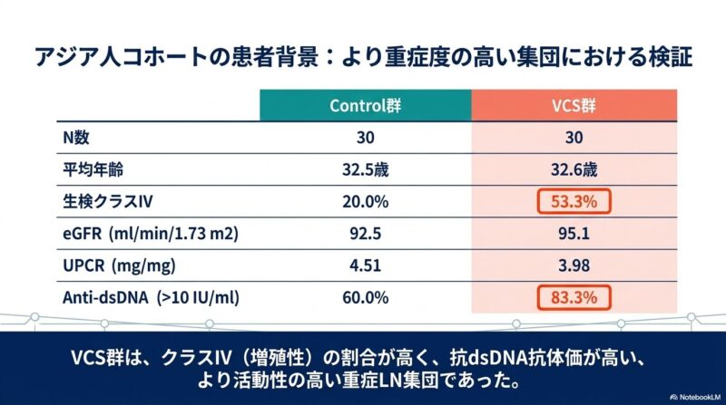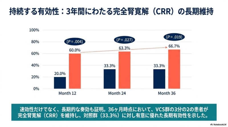 2. 長期腎反応(CRR)の達成率 36ヶ月時点でのCRR達成率はVCS群で66.7%、対照群で33.3%であり、長期にわたる高い治療反応性が維持されている(OR 3.97, P=.019)。アジア人の対照群ではUPCR目標達成に約27ヶ月を要しており、標準治療のみでは反応が遅れる傾向がある中で、VCSの併用が極めて有効であることが示唆されている。
