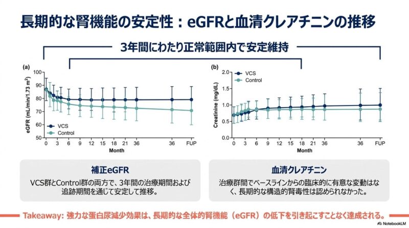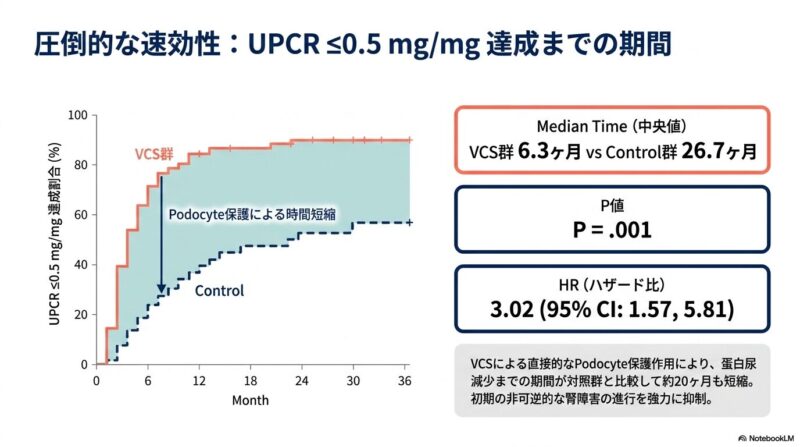 1. 蛋白尿減少の速効性と持続性 3年間の観察期間において、UPCR ≤ 0.5 mg/mgを達成した割合はVCS群で90.0%6.3ヶ月であり、対照群の26.7ヶ月と比較して顕著に短縮している(HR 3.02, P=.001)。また、50%以上の蛋白尿減少(PRR)もVCS群では全例(100%)が達成し、その中央値はわずか1.0ヶ月。