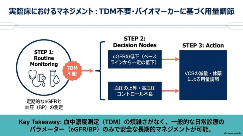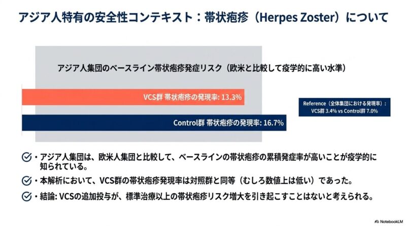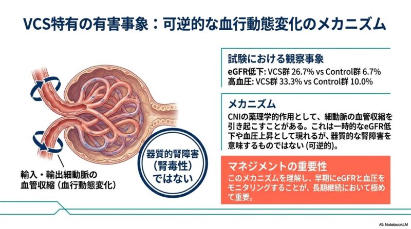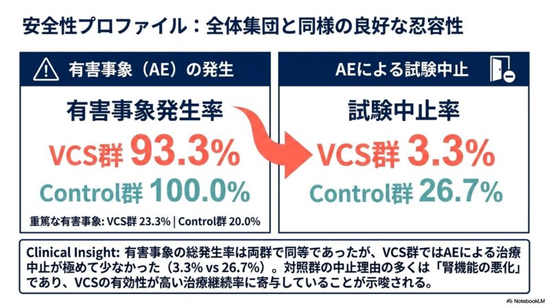 3. 安全性と忍容性 有害事象(AE)の発生率は両群で同等(VCS群 93.3% vs 対照群 100.0%)。CNI関連のAEとして、eGFR低下(26.7% vs 6.7%)や高血圧(33.3% vs 10.0%)の発現率はVCS群で高かったものの、AEによる投与中止率はVCS群で低く(3.3% vs 26.7%)、良好な忍容性を示した。また、アジア人で懸念される帯状疱疹の発現率は両群で差はなく(13.3% vs 16.7%)、VCS使用による過度なリスク増大は認められなかった。