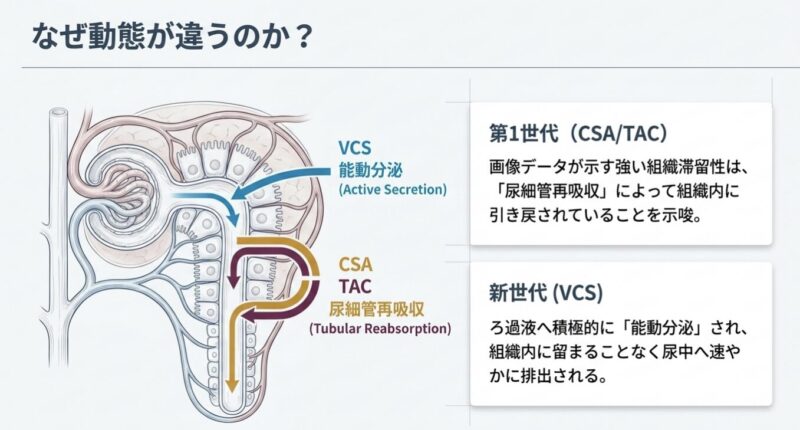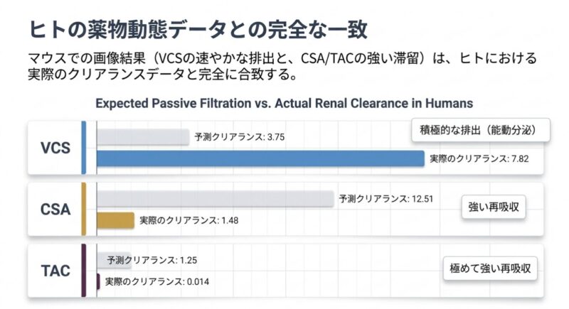 今回のマウスでの観察結果は、ヒトにおける腎排泄機序と整合しています。ヒトにおいてCsAとTacの腎クリアランスは受動濾過期待値のそれぞれ約10%および2%未満であり、尿細管での「再吸収」が示唆されます。一方、VCSの腎クリアランスは受動濾過期待値の約200%であり、近位尿細管における「能動分泌」が優位(支配的)であることが示されています。