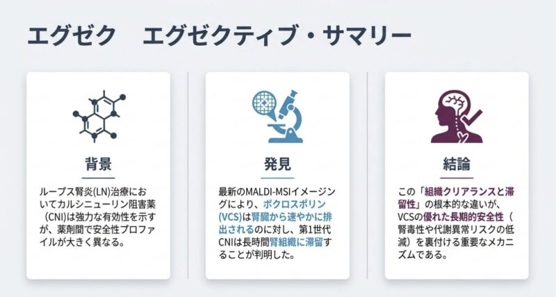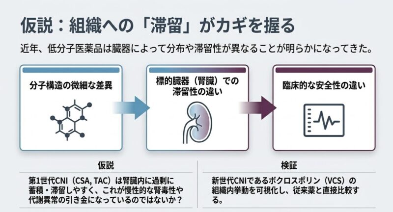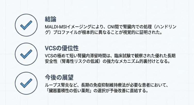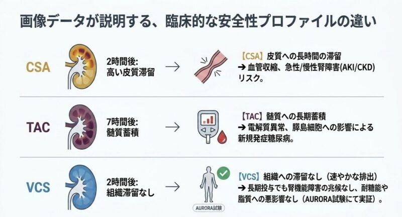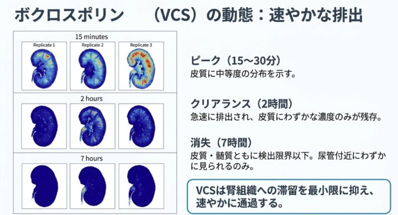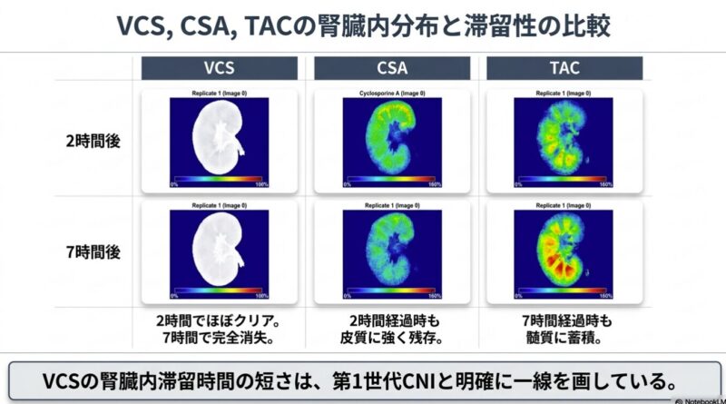 VCSが他のCNIと比較して腎組織内での滞留時間が極めて短いことが示されています。CsAやTacが腎組織(特に尿細管上皮細胞)に長時間留まることは、直接的な細胞毒性や血行動態の変化を介した急性・慢性腎障害の一因と考えられています。VCSの「迅速な消失」と「能動分泌」という特性は、腎臓への累積的な曝露を最小限に抑え、臨床試験(AURORA試験)で示された良好な腎安全性プロファイルを裏付ける薬理学的根拠となりえます。
