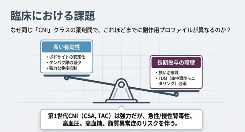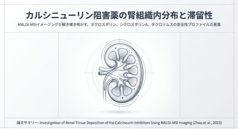 カルシニューリン阻害薬(CNI)は、T細胞のインターロイキン-2(IL-2)産生を抑制する免疫抑制作用に加え、糸球体ポドサイトのシナプトポジン脱リン酸化阻害を介した細胞骨格安定化作用を有し、ループス腎炎(LN)治療の基石となっています。しかし、第一世代CNIであるシクロスポリンA(CSA)やタクロリムス(TAC)は、慢性的な腎毒性や代謝異常(高血糖、脂質異常症)が長期投与の障壁となってきました。第二世代CNIであるボクロスポリン(VCS)と第一世代薬の腎組織内動態をMALDI-MSI(マトリックス支援レーザー脱離イオン化質量分析イメージング)を用いて比較した研究成果をまとめました。