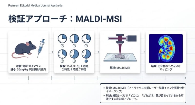 健康なCD-1マウスを用い、VCS、CSA、TAC(各30 mg/kg)を単回静脈内投与した後の腎組織内における薬剤の分布と滞留時間をMALDI-MSIにより経時的(15分〜7時間)に評価。MALDI-MSIは組織切片上の化合物のイオン強度を二次元画像化する手法であり、従来の組織均質化法では困難であった「組織内のどの部位にどの程度薬剤が留まっているか」の可視化を可能にします。