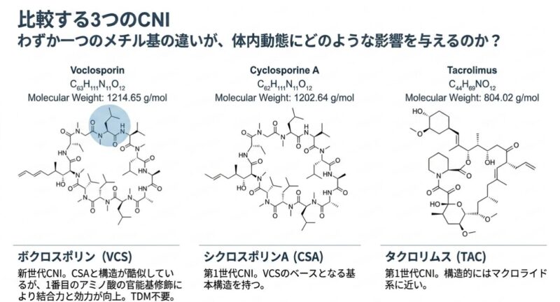 また、VCSは第一世代薬と異なり、治療薬物モニタリング(TDM)を必要としない安定した薬物動態を示し、脂質代謝や血糖管理においても有利なエビデンスを有しています。これらの特性は、LN患者における3年以上の長期寛解維持療法において、腎機能を保護しつつステロイドを減量(ステロイド・ミニマム戦略)するための強力な武器とも言えます。