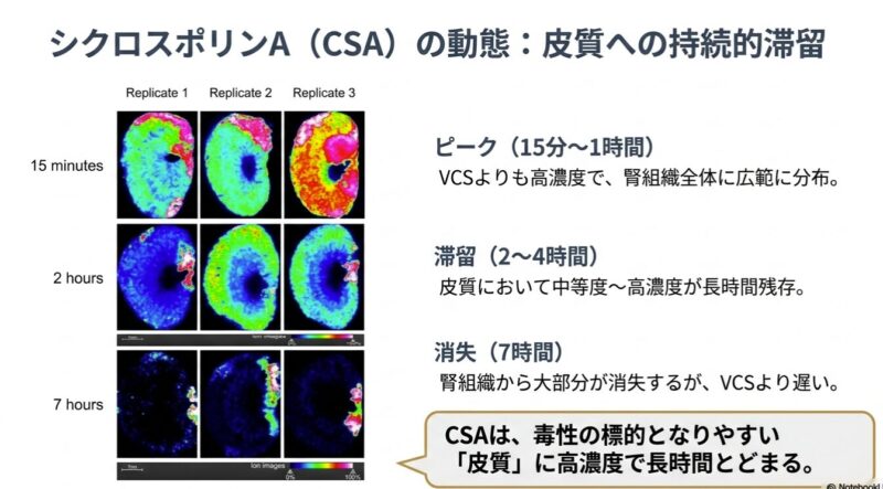 • シクロスポリンA(CSA): VCSよりも高濃度で腎組織全体にびまん性に分布し、皮質における滞留性も高く、投与4時間後でも中等度の濃度が維持されていました。