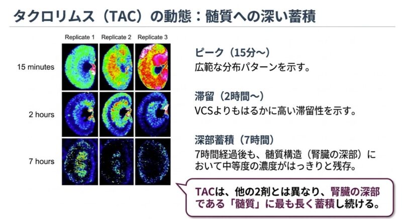 • タクロリムス(TAC): 腎組織全体にびまん性に分布し、特に髄質において顕著な滞留性を示し、投与7時間後でも中等度の濃度が検出されました。