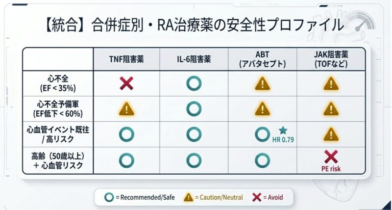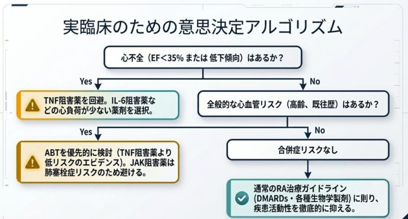 結論として、心疾患合併リウマチ患者の診療では、個々の心機能や血栓リスクに基づき、アバタセプトやIL-6阻害薬を優先的に検討する個別化医療の視点が不可欠です。
