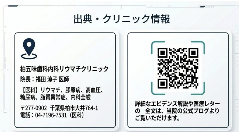 柏市・我孫子市周辺で、関節の痛みだけでなく、息切れや動悸など心臓への負担が気になる方や、ご自身の病態に合った最適な抗リウマチ薬の選択でお悩みの方は、どうぞお気軽にご相談ください。