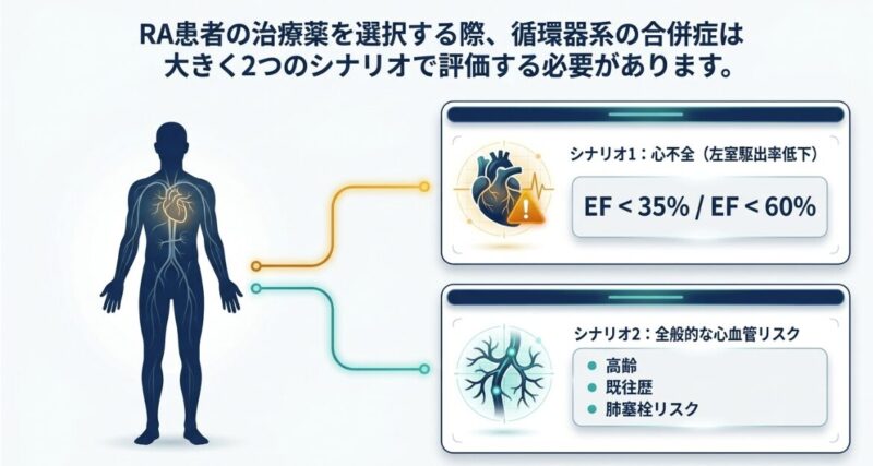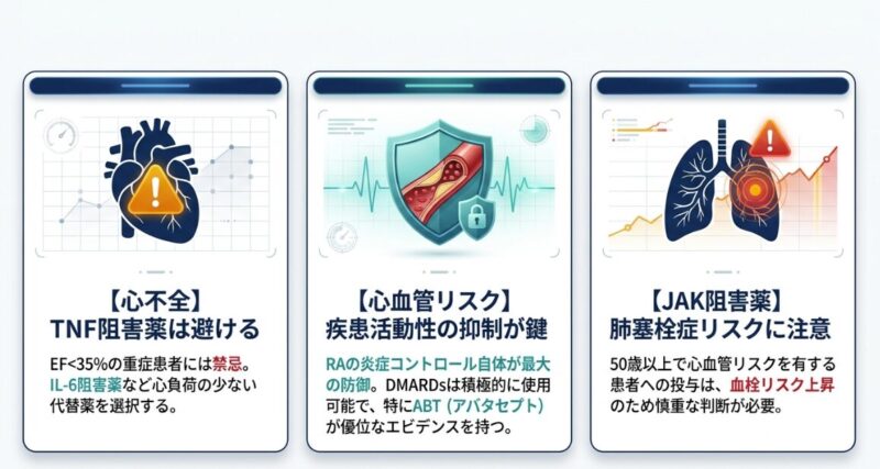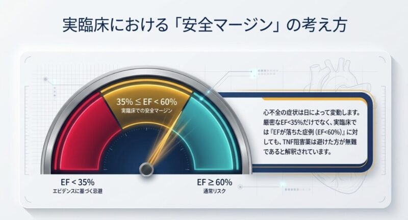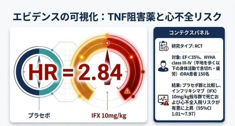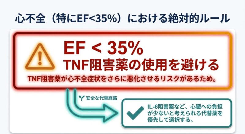 しかし、心不全(特に左室駆出率 EF < 35% やNYHA分類III/IV)を伴う症例では、TNF阻害薬が症状を悪化させ、死亡や心不全入院のリスクを高める(HR=2.84)ことがRCTで示されており、使用を避けるのが原則です。実臨床では安全策として、EF < 60%の段階からTNF阻害薬を控える医師も少なくありません。こうした症例では、心臓への負担が少ないと考えられるIL-6阻害薬(トシリズマブ等)が有力な代替選択肢となります。