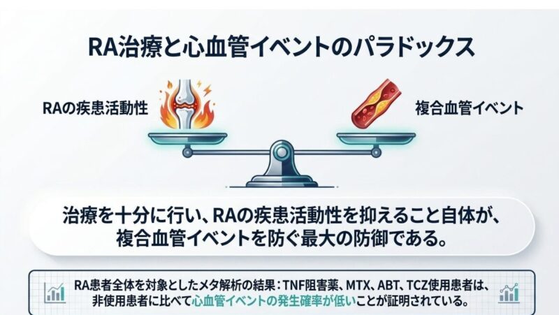 心血管リスクや心不全を合併する関節リウマチ(RA)患者の治療において、抗リウマチ薬の選択は予後を左右する極めて重要な判断となります。RAそのものが心血管イベントの独立した危険因子であるため、メトトレキサート(MTX)疾患活動性を十分に抑制することは、トータルの心血管リスク低減に寄与します。