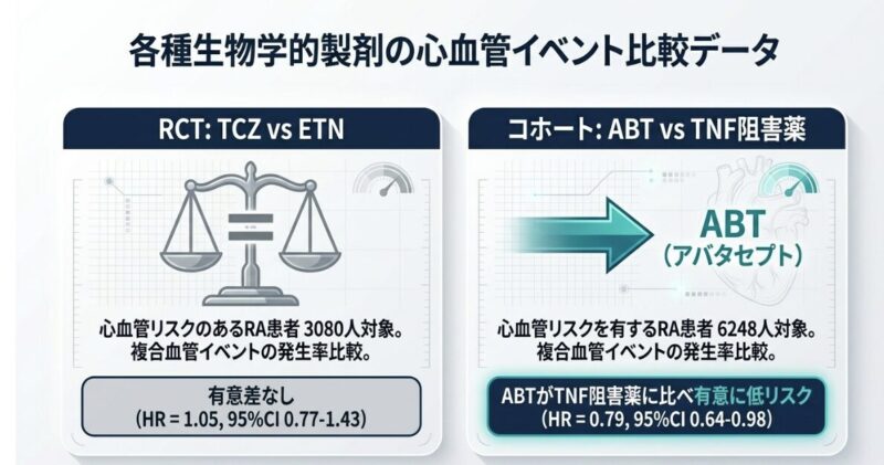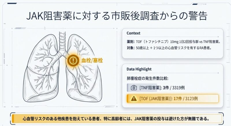 また、心血管リスクが高いRA患者を対象とした大規模コホート研究では、アバタセプト(ABT)がTNF阻害薬と比較して複合心血管イベントの発生率を有意に抑制した(HR=0.79)と報告されており、高リスク群におけるABTの優位性が示唆されています。一方で、JAK阻害薬(トファシチニブ等)については、高齢かつ心血管リスクを有する患者において肺塞栓症のリスク増加が注意喚起されており、他疾患を抱える患者への投与には慎重な検討が必要です。